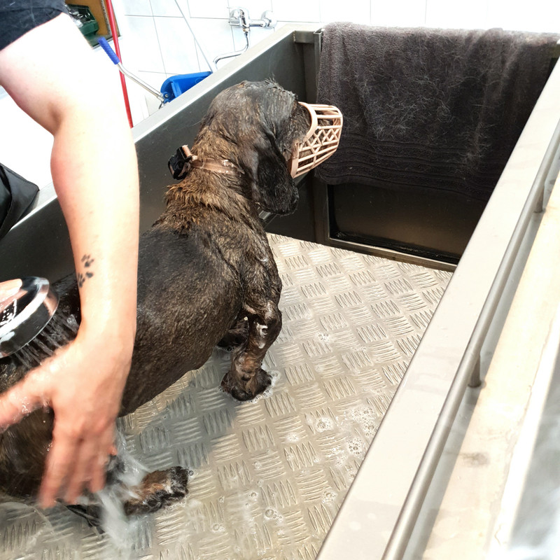 Carambar est retourné au toilettage par contre il a voulu attaquer directement la toiletteuse…donc il a eu une muselière