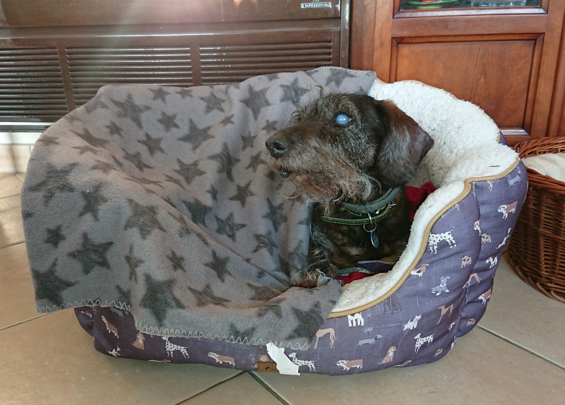 Je viens de rentrer, la petite s’est très bien comportée chez son président et a dormi pour le trajet de retour. Après un petit tour dans le jardin pour les besoins d’usage tout le monde s’est installé pour la nuit, et la petite a choisi une panière ou elle s’est enfoncée dans une couverture douillette. Elle sait choisir les bonne places !