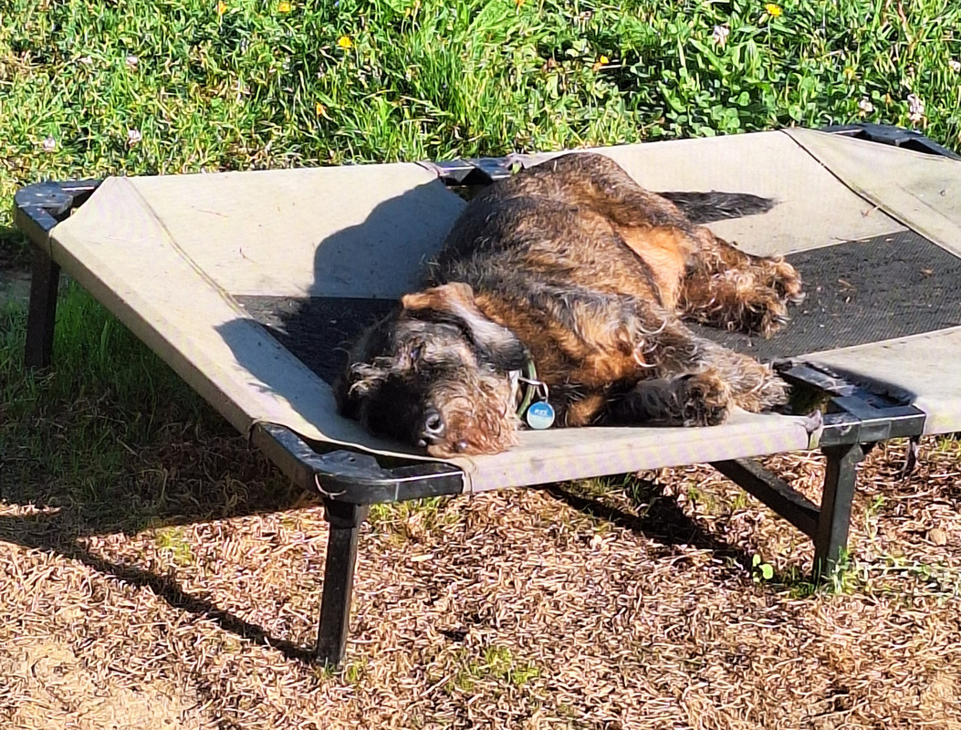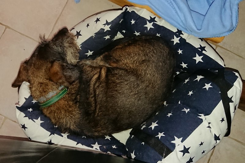 Ebène vieillit doucement, sa vue continue de baisser et elle dort beaucoup, y compris sur "des tas de cailloux" du moment qu’elle me sent près d’elle