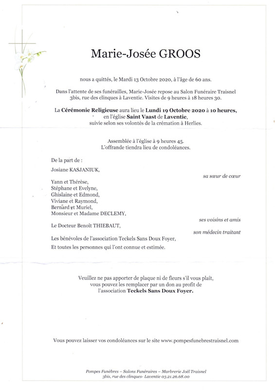 Chers adhérents, avant de nous quitter MARIE JO à fait son faire part de décès(seule la date n’avait pas été précisée, elle voulait quasiment le même que sa maman), en présence de son notaire et de 3 témoins…
