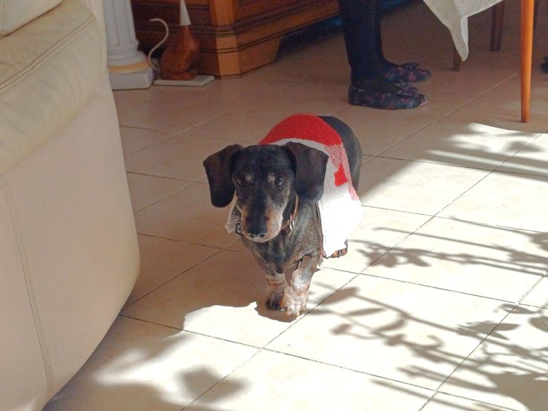 Aujourd’hui mon tonton m’a emmené voir des hommes en verts pour regarder mon coeur (ion lui a fait une écho cardiaque). Je n’ai pas été très sympa avec eux. Mon tonton et ma tatie peuvent me triturer mais les autres …j’aime pas, na ! Tatie Sylvie a dit à tonton que j’étais un vrai teckel, ça veut dire quoi ça ?