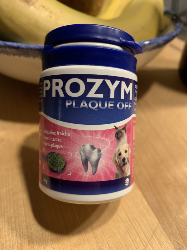 C est bien prozym ce sont des algues malheureusement les petits chiens ont quasiment tous ce genre de problème à cause d une hyper acidité de la salive.