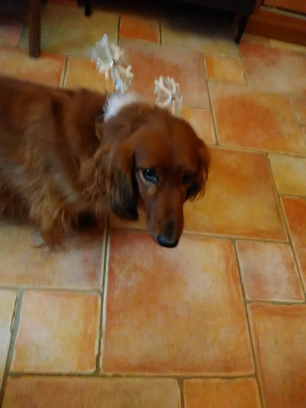 Elle aboie fort quand c’est l’heure de la "gamelle" deux fois par jour et le soir après la balade avant de se coucher pour les petits gâteaux autre rituel instauré depuis des années pour nos poilus (6 à une époque et chacun avait sa place )