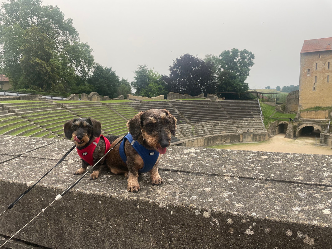 Pause repas sur une terrasse dans la vieille ville dAvenches et visite des arènes romaines.