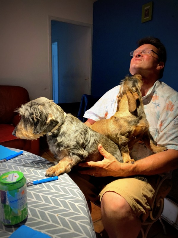 Tant pis, nous mangerons a l’intérieur , sous la clim, 40 prévu aujourd’hui, ce sera mieux pour les 2 et 4 pattes et puis ca permettra à mes Lardons de faire connaissance avec les Filles dans une proximité plus adaptée à la situation