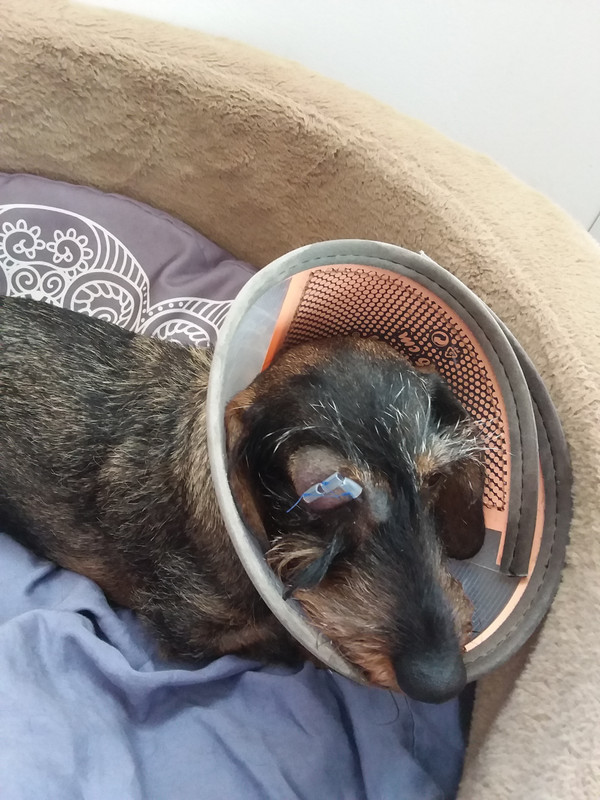 l’intervention c’est bien passée, contrôle mardi et retrait des fils dans 10 jours mais il faut garder la collerette 3 semaines et en aucun cas l’ enlever. elle est sous antibiotique et des gouttes pour l’oeil. l’ oeil est impressionnant à regarder