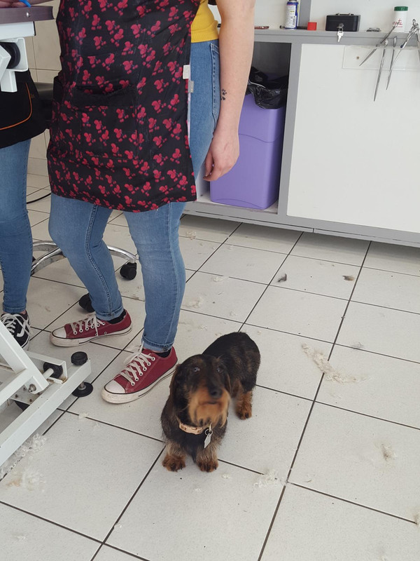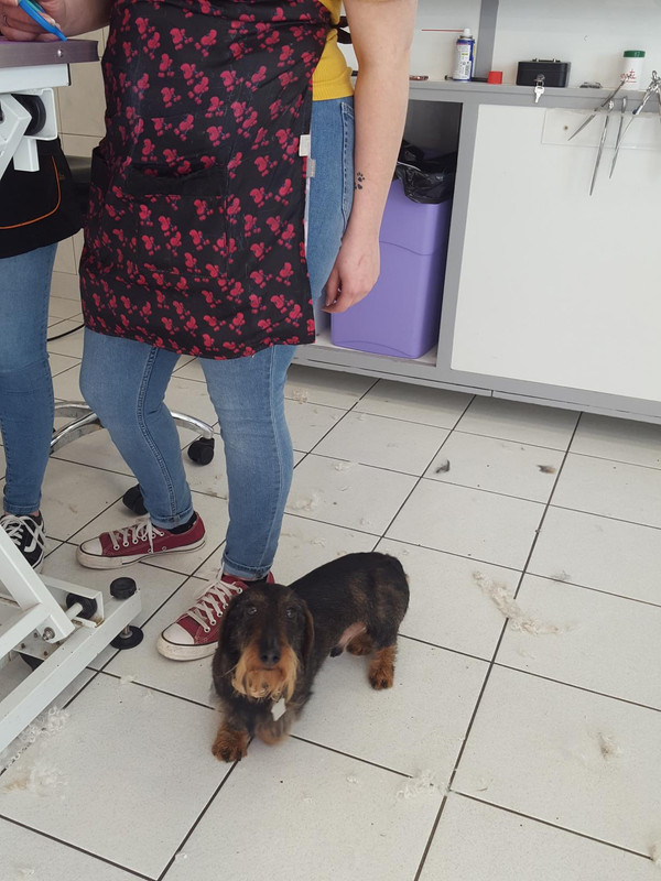 Nico est exploité tous les jours… Il est devenu un teckel travailleur en salon de toilettage…