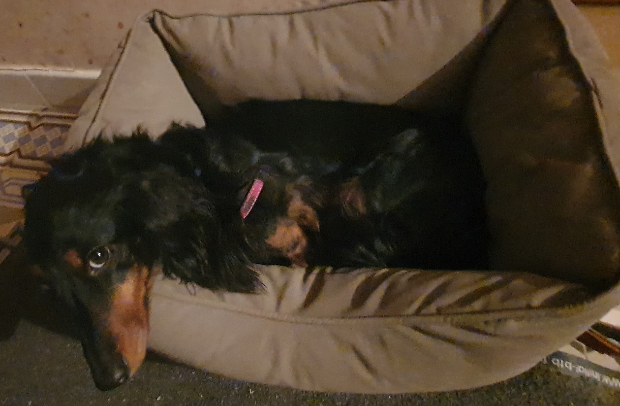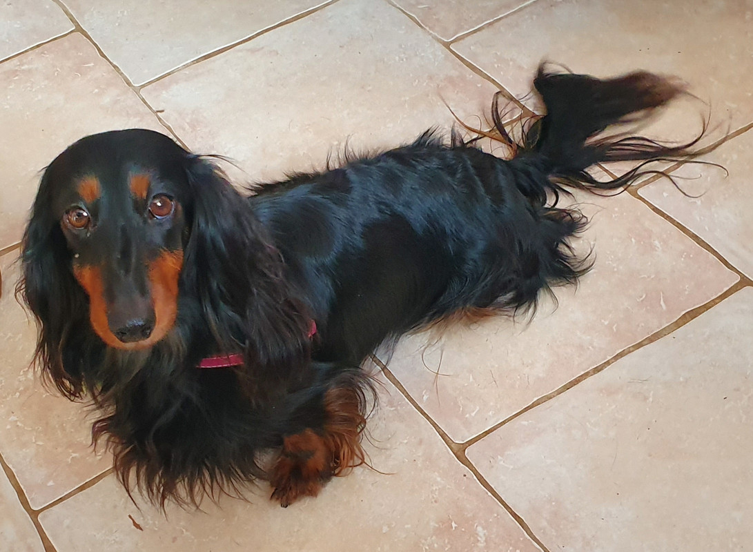 Dapparence : Teckel naine poil long noire et feu
