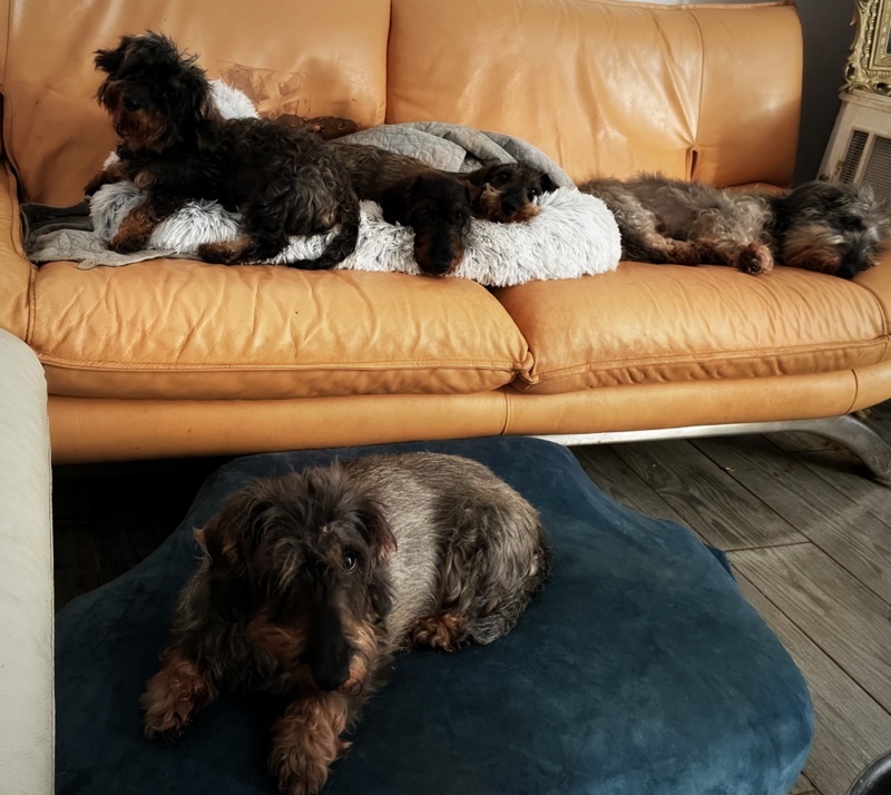 Les Lardons en plan large , Moustache a droite et Harrybeau en bas, 12 ans chacun , les 2 Filles dorment sur l’autre canapé ; loin des " couillons" ( disent elles)
