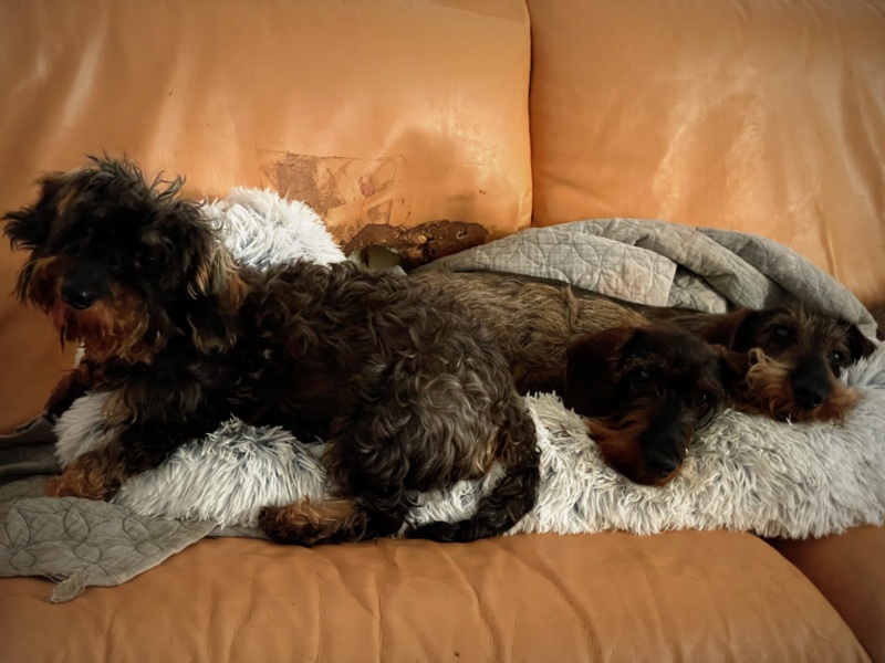 Les 3 grasses! Ratatouille, Zozo 14 ans, Hunki 12 ans. Vous remarquerez un gros trou dans le canapé , derrière le dodo, "on" m’ a dit qu’une souris était la fautive , quand j’ai retorqué que la souris devait bien faire dix kilos , il me fut répondu que j’etais nulle en rongeurs !…..