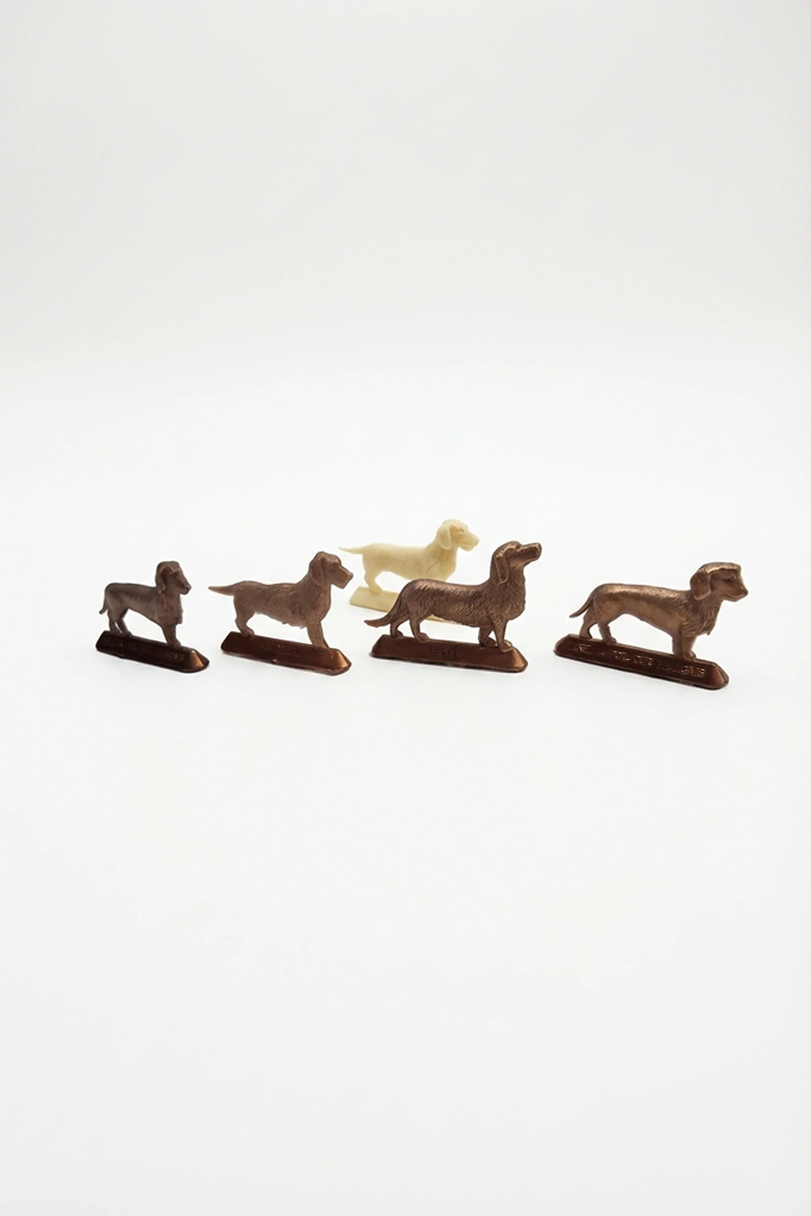 Lot de 5 figurines teckel publicité de la marque “chocolat Salavin”.